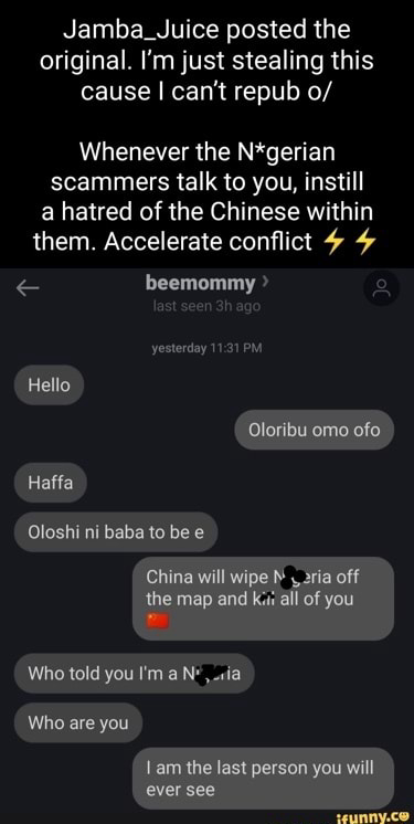 Jamba_Juice posted the original. I'm just stealing this cause I can't repub o/ Whenever the N*gerian scammers talk to you, instill a hatred of the Chinese within them. Accelerate conflict 4 4 beemommy last seen 3h ago yesterday 11:31 PM Hello Oloribu omo ofo Haffa ni Oloshi ni baba to be e China will wipe aria off the map and Kilt all of you Who told you I'm a N', ria a Who are you am the last person you will ever see _ifunny.co â¢funny.co